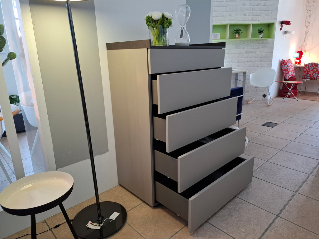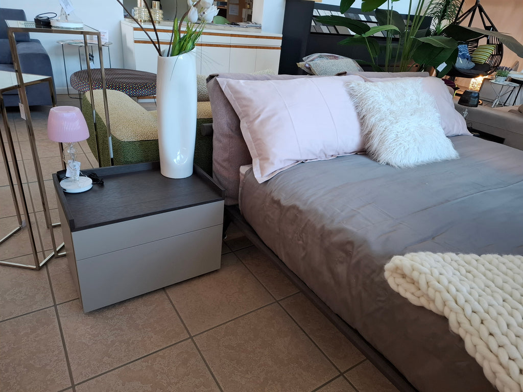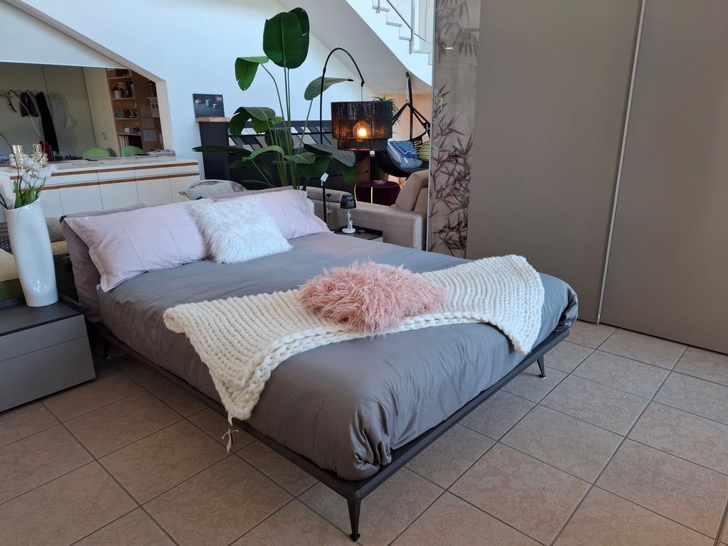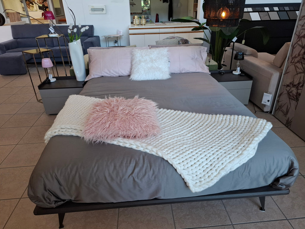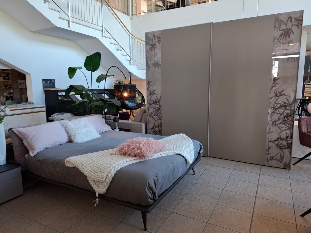 Composizione camera matrimoniale di Tomasella composta da letto Piuma caratterizzato da rete strutturale 4 cm con doghe in legno, armadio Strip con due ante scorrevoli e fascia decorativa in vetro serigrafato, con struttura in materico, attrezzato internamente, 2 comodini laterali con 2 cassetti ciascuno e settimanale composto da 5 cassetti