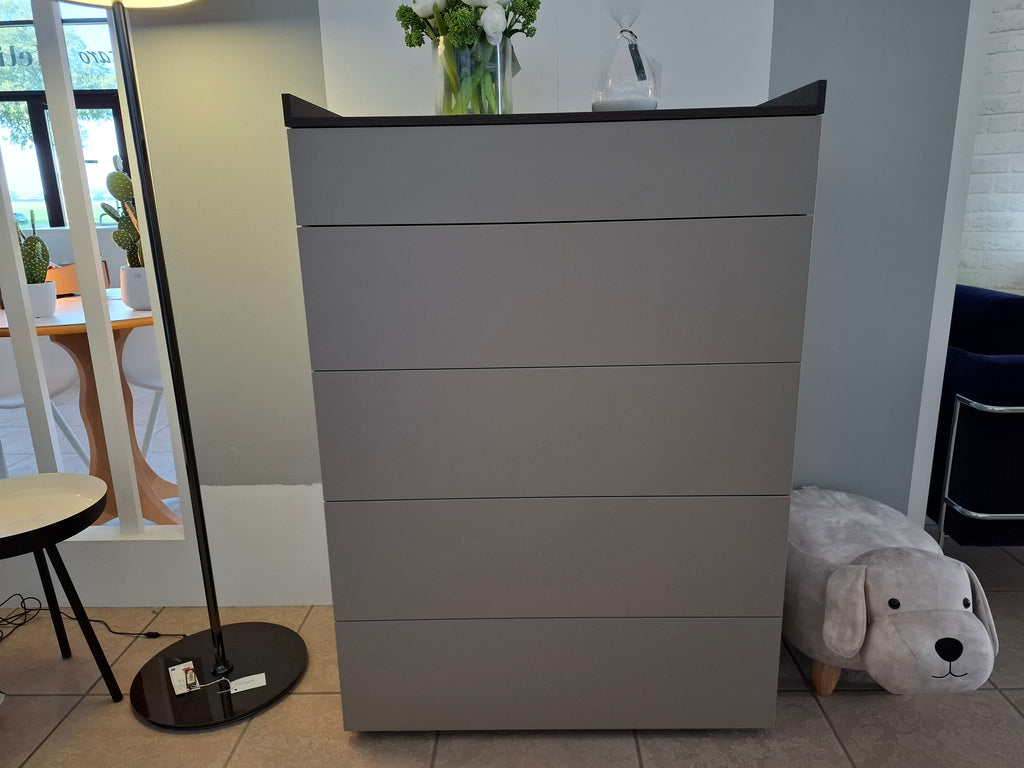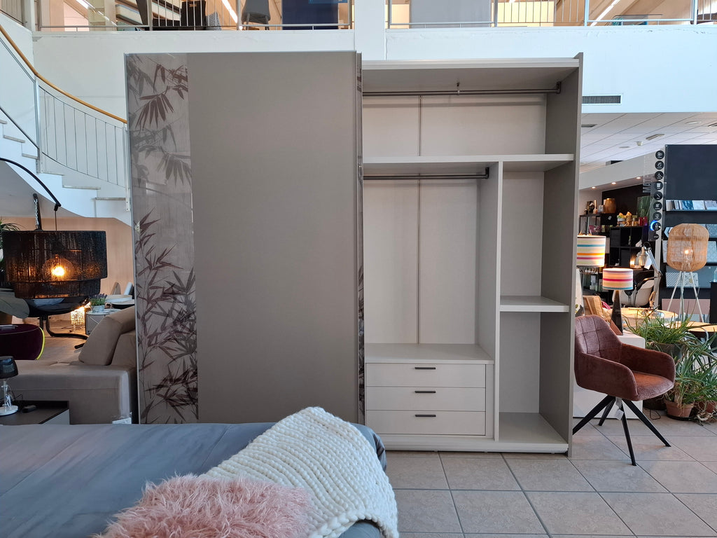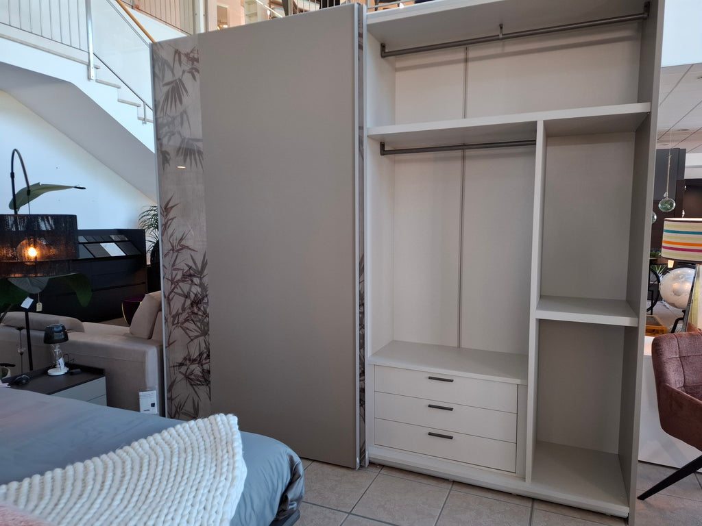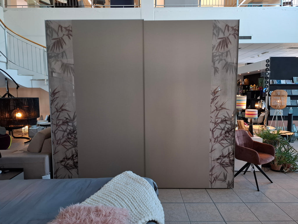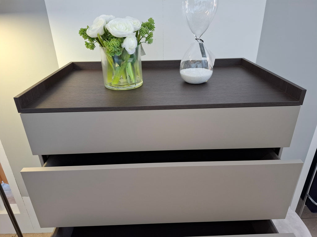 Composizione camera matrimoniale di Tomasella composta da letto Piuma caratterizzato da rete strutturale 4 cm con doghe in legno, armadio Strip con due ante scorrevoli e fascia decorativa in vetro serigrafato, con struttura in materico, attrezzato internamente, 2 comodini laterali con 2 cassetti ciascuno e settimanale composto da 5 cassetti